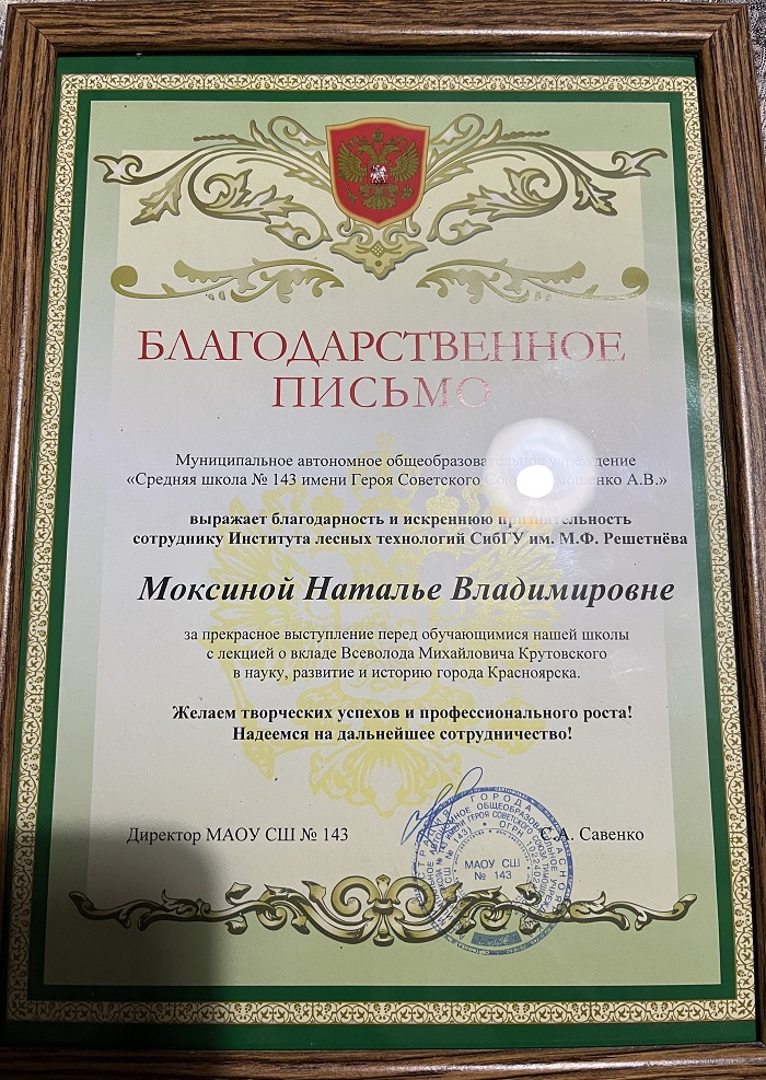 - За прекрасное высткупление перед обучающимися нашей школы с лекцией о вкладе Всеволода Михайловича Крутовского в науку, развитие и историю города Красноярска. Желаем творческих успехов и профессионального роста! Надеемся на дальнейшее сотрудничество! – говорится в тексте письма.