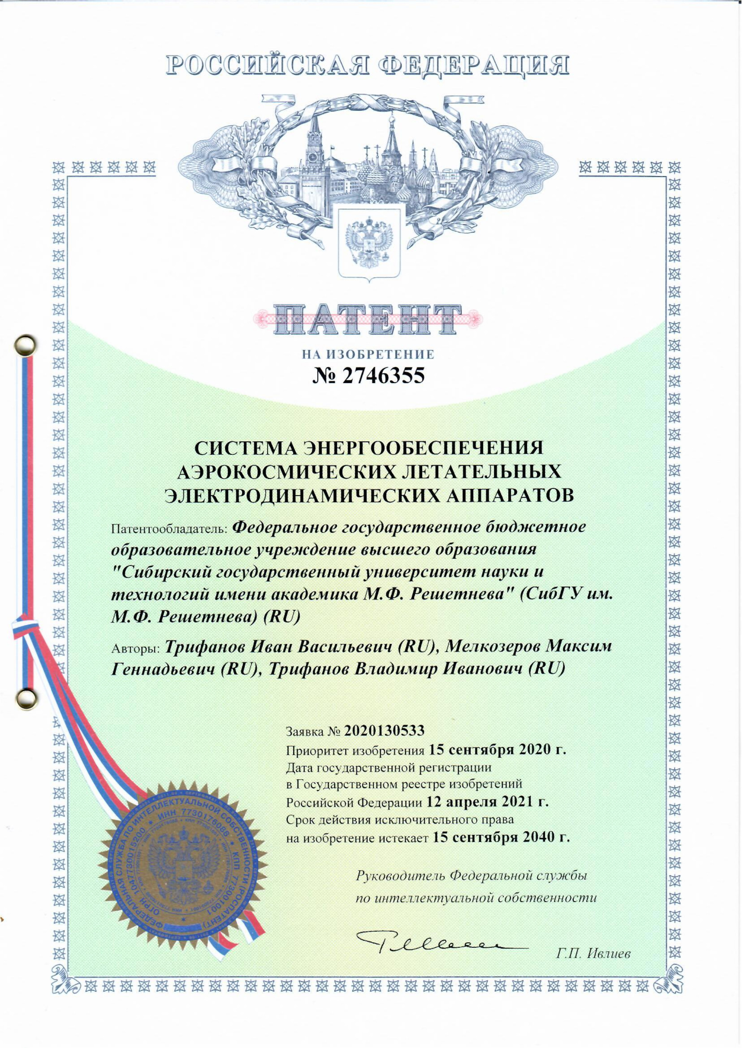 Патент на изобретение 2746355 от 12.04.2021